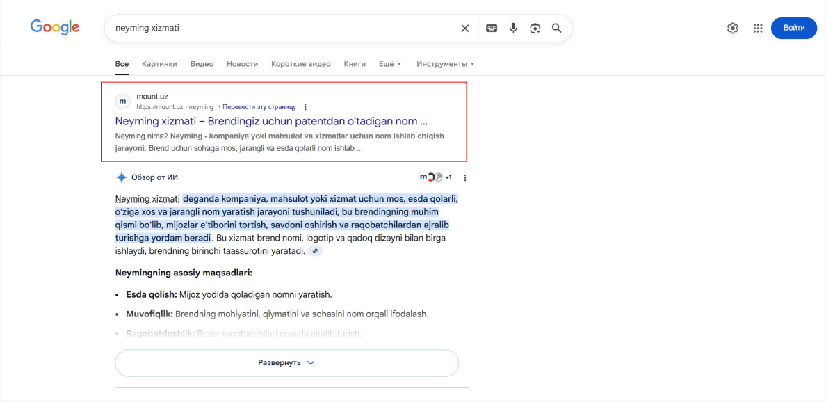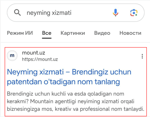 ✔️ “Naming xizmati” deb qidirilganda esa — bizning mijozimiz sayti Google’da 1-o‘rinni egallab turibdi.