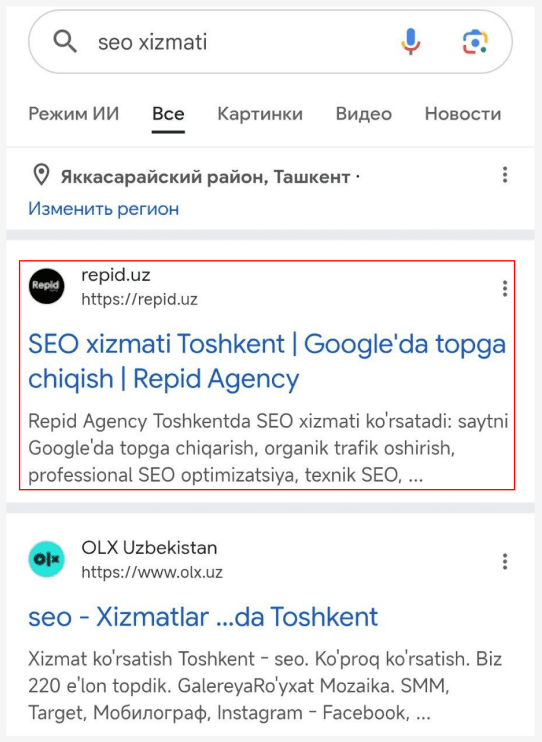 ✔️ “SEO xizmati” deb Google’da qidirilganda — bizning o‘z saytimiz hech qanday Google Ads’siz, faqat organik (toza) SEO orqali 1-o‘rinda chiqyapti.